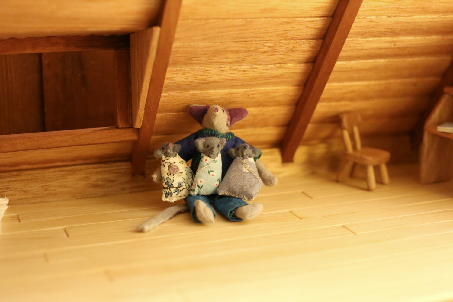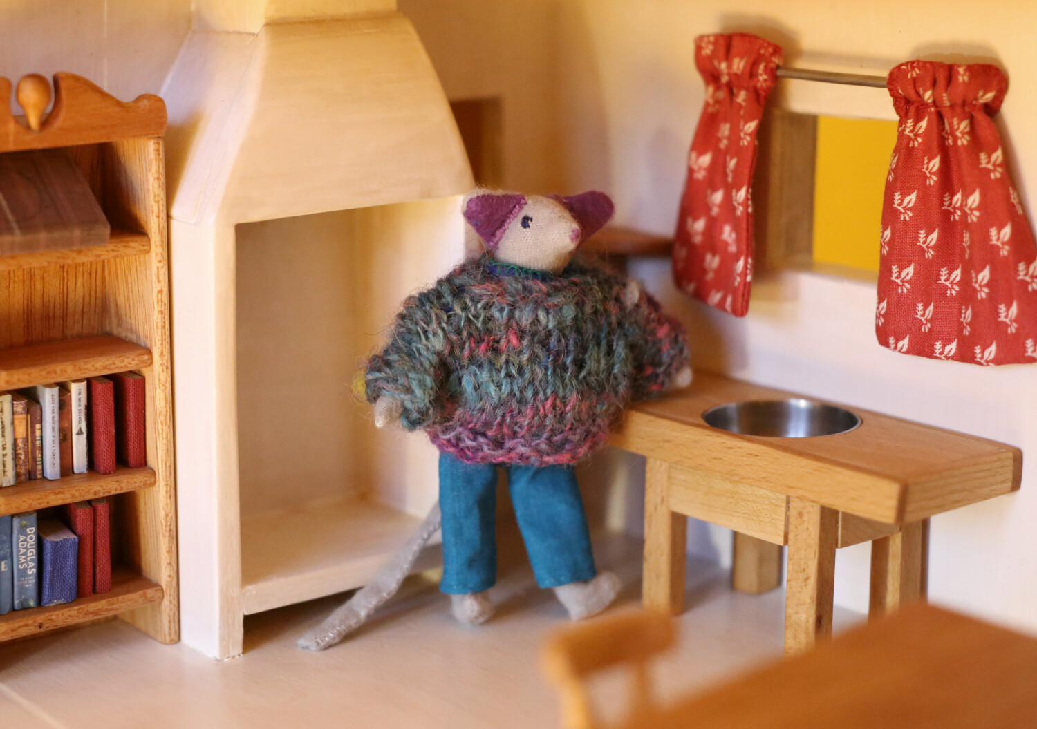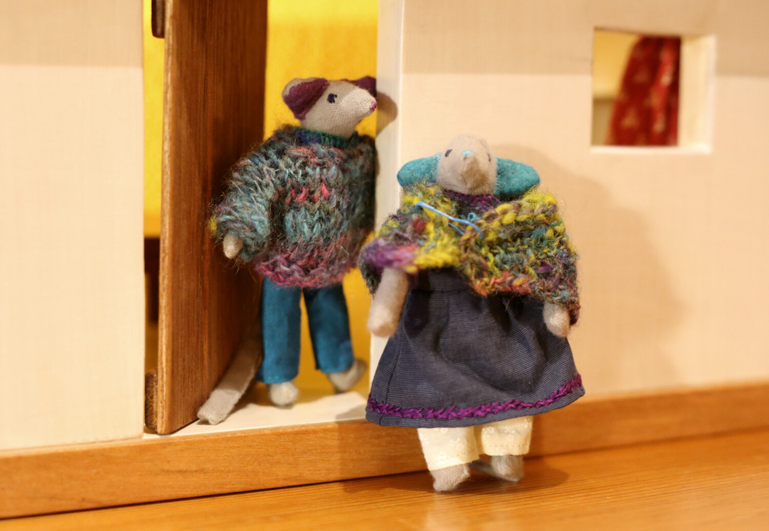 Een vriendin heeft nog een trui en een omslagdoek gebreid om de muizen warm te houden en mijn man maakte mini-boekjes voor in de boekenkast met zelfs een echte atlas!