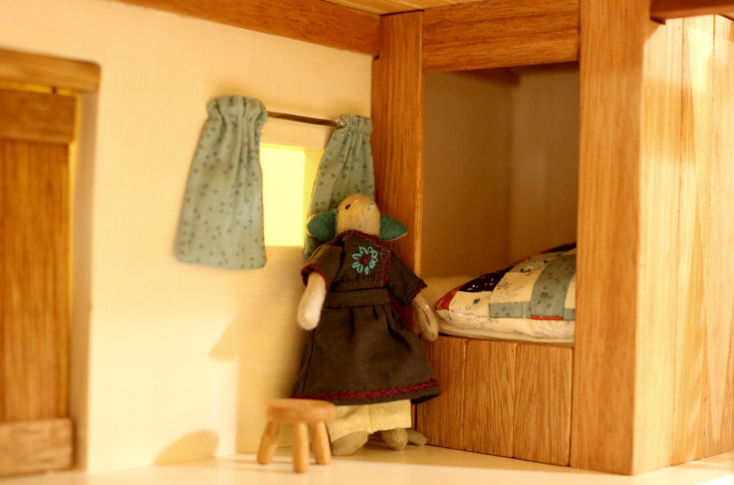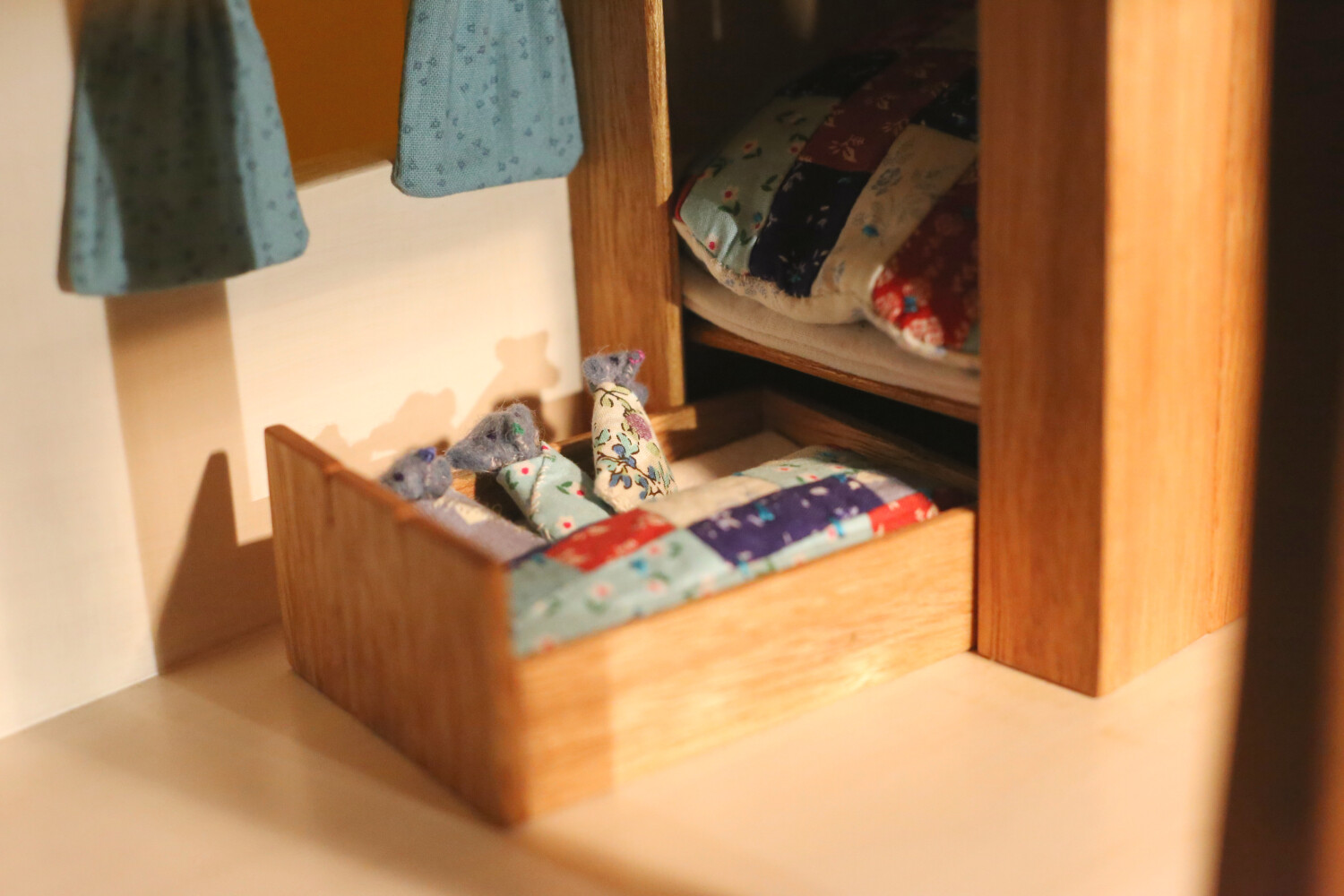 De familie Muis slaapt in de bedstee met eronder een bedje verstopt voor de baby-muisjes.